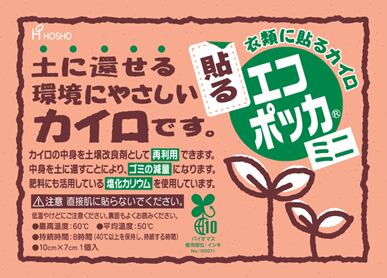 『エコポッカ』は従来のカイロに使用している塩化ナトリウムの代わりに、肥料にも用いられる塩化カリウムを使用することで、使い終わった後のカイロの中身(粉状の黒い粉)を土に還せるようにした環境にやさしいカイロです。