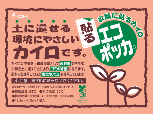 『エコポッカ』は従来のカイロに使用している塩化ナトリウムの代わりに、肥料にも用いられる塩化カリウムを使用することで、使い終わった後のカイロの中身(粉状の黒い粉)を土に還せるようにした環境にやさしいカイロです。